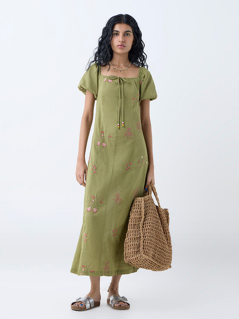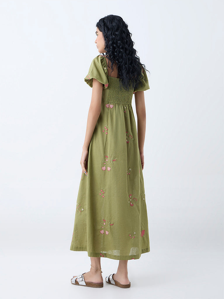 Boost your holiday edit with this olive dress by Bombay Paisley. Adorned with eye-catching floral motifs, it is shaped in an A-line silhouette and made from a premium cotton-blend fabric. The square neck, puff sleeves, and smocked back ensure an effortless fit, while convenient side pockets add a practical finish.