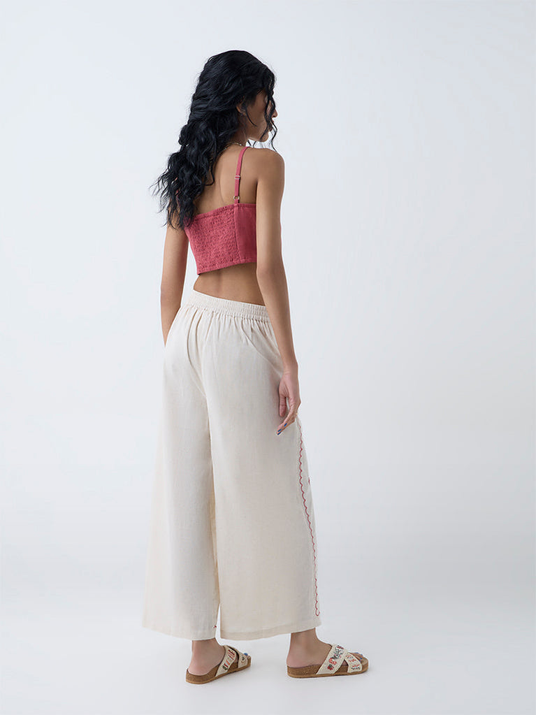 Move through your day with ease and style in these off-white palazzos from Bombay Paisley. Milled from a cotton-rich fabric for daily comfort, they come fitted with an elasticated waistband and side pockets. The delicate floral embroidery throughout accentuates its appeal.