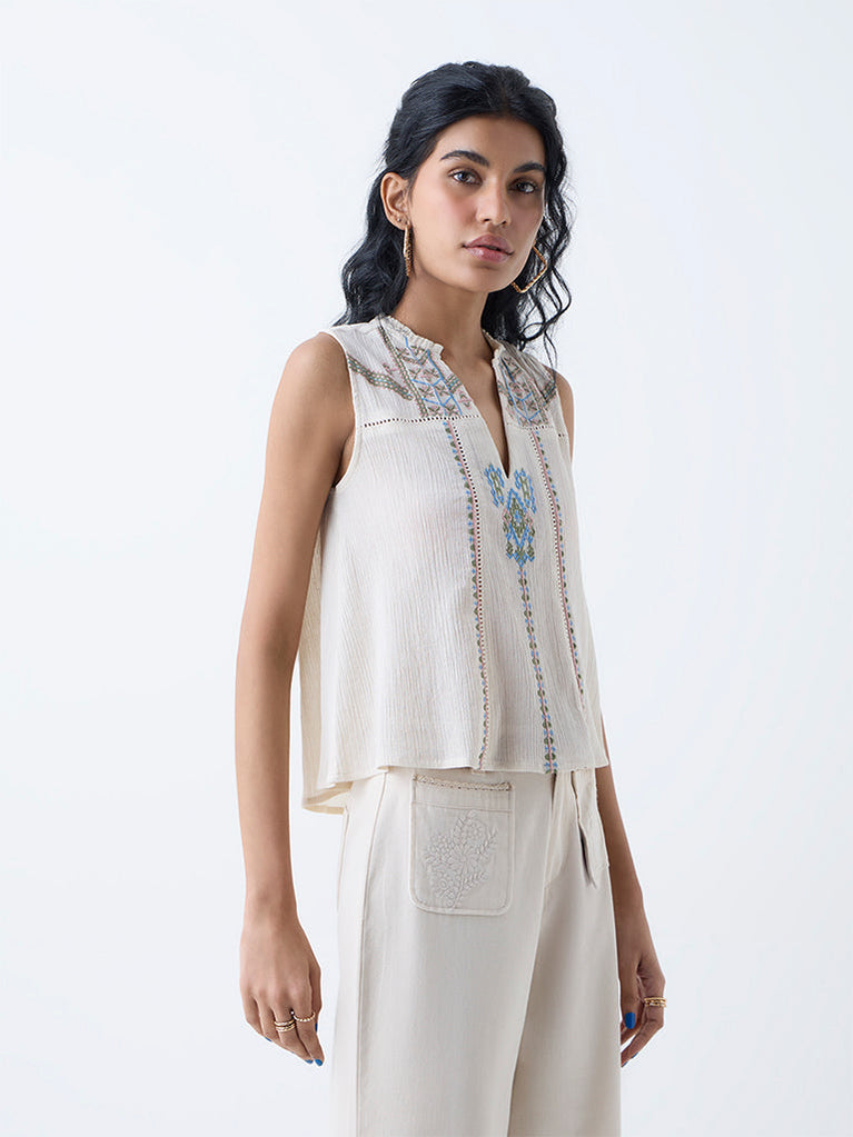 Enhance your style quotient with this off-white top from Bombay Paisley. Cross-stitch embroidery on a crinkle-textured layer brings subtle artistry, while a V-neck and sleeveless cut keep it breezy and modern. Constructed from a cotton-rich fabric, it offers superior comfort throughout the day.
