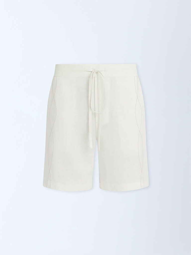 Revamp your downtime with these white shorts by ETA, designed to move as freely as your plans. Woven from a breathable fabric in a relaxed silhouette, they feature delicate embroidered work on the front, and are fitted an elasticated drawstring waistband and multiple pockets for added utility.