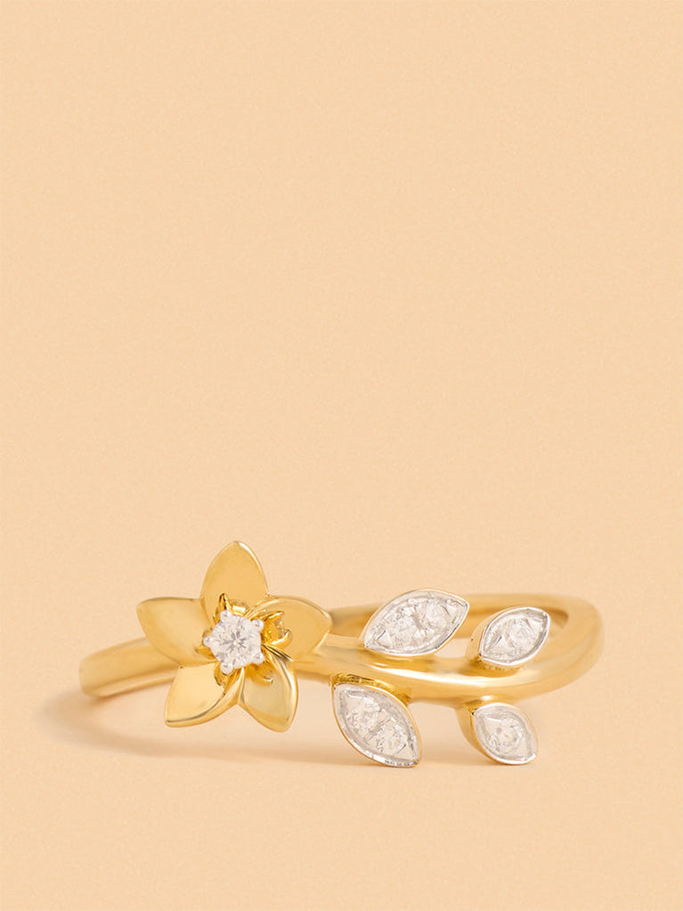This gold floral solitaire ring from Westside X Pome features a delicate floral motif with a polished gold-tone band. A clear central stone sits at the heart of the design, complemented by small leaf-shaped accents along the band, each adorned with clear stones. With its slender profile and subtle detailing, this piece brings a refined touch to both everyday wear and special occasions.