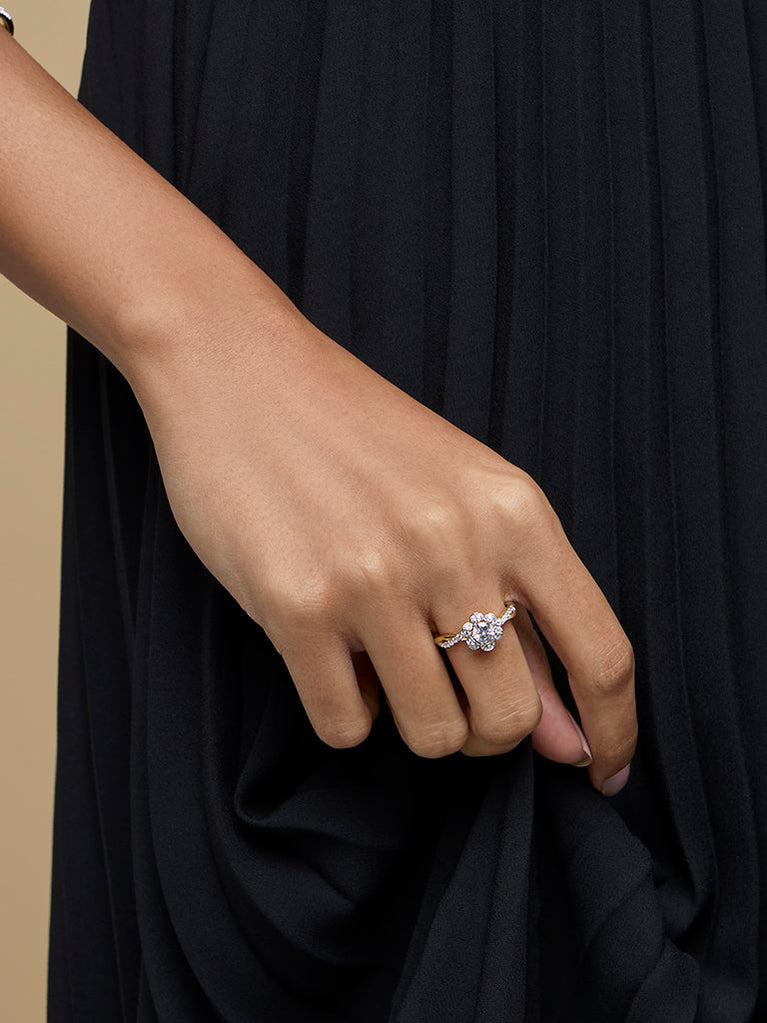 Westside X Pome presents this classic floral ring, crafted with a polished gold-tone band. The design features a central clear stone surrounded by smaller stones in a delicate halo arrangement, while additional stones along the band add a subtle shimmer. With its refined details and timeless appeal, this piece effortlessly complements both everyday looks and special occasions.