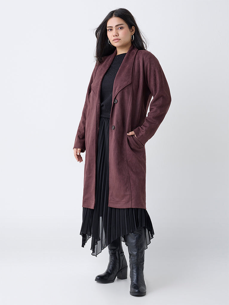 Crafted in soft suede for warmth and timeless appeal, this dark brown trench coat from Gia brings elegance to winter layering. The open front with fluid lapels creates a sophisticated silhouette, while full sleeves and practical pockets add everyday functionality.