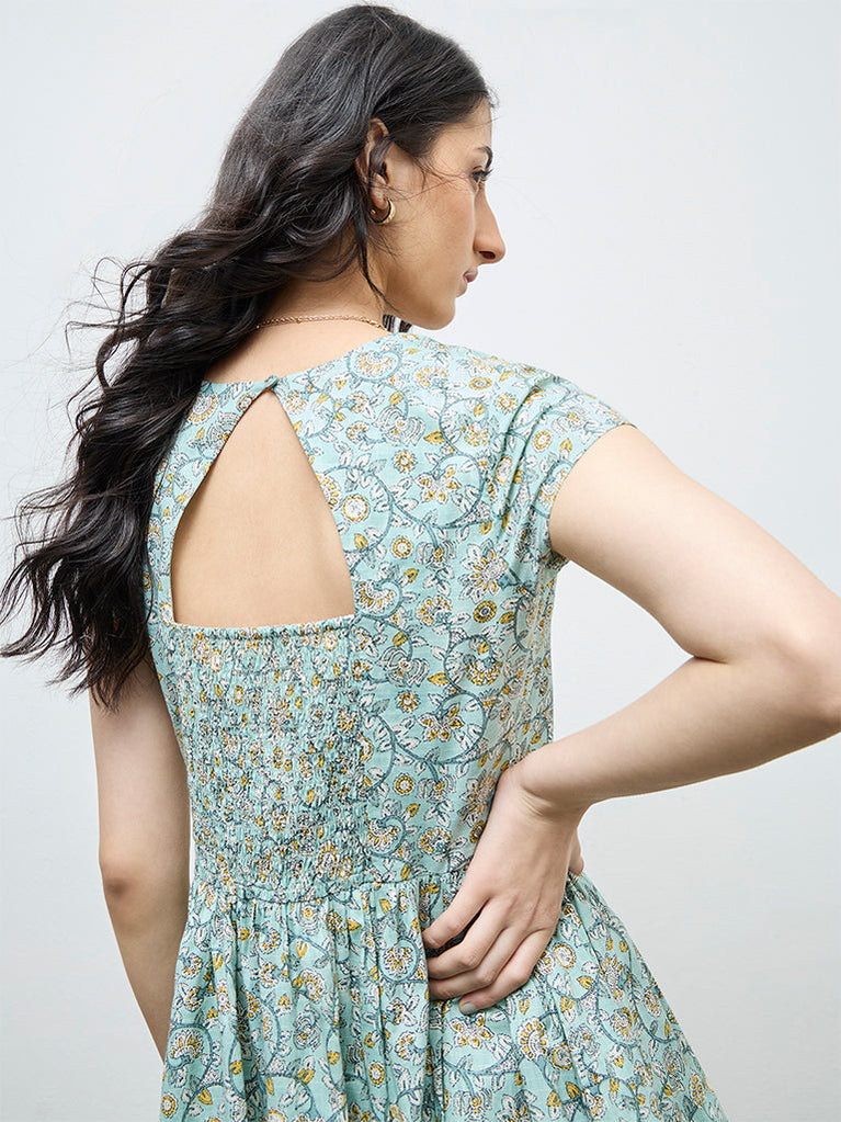 Balance femininity and comfort in this mint dress from Bombay Paisley, patterned with delicate floral motifs. Spun from breathable pure cotton, it features a wrap-style V-neck that flatters the frame, while the smocked back with a cut-out detail offers flexibility. Cap sleeves and A-line silhouette complete the breezy appeal.