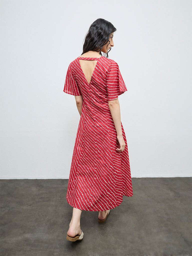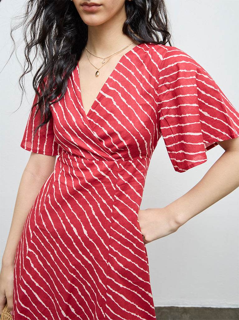 A refreshing addition to your summer wardrobe, this red dress from Bombay Paisley showcases stripe patterns on an A-line structure. It is styled with a V-neck, angel sleeves and completed with a back zipper for an easy wear experience. Crafted from a cotton-rich fabric, this is well suited for warm days, casual plans, and relaxed styling.