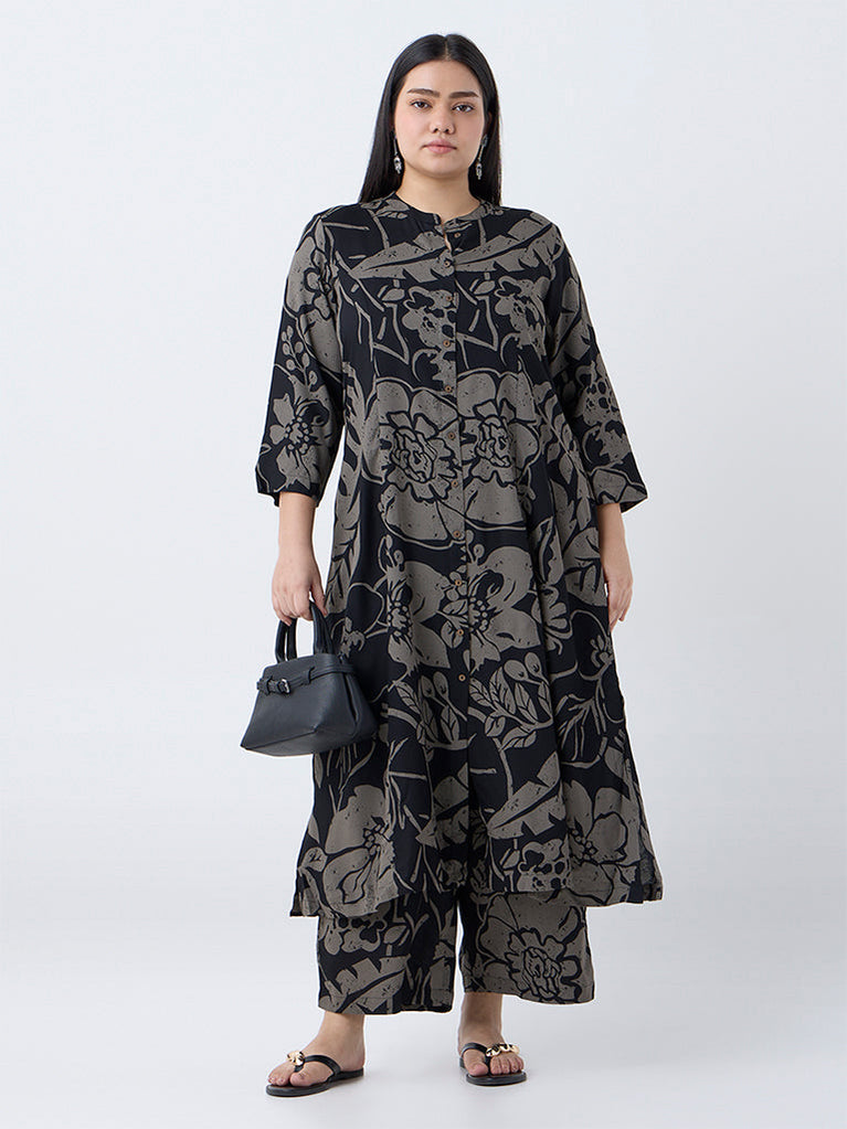 Diza Black Floral Embroidered Cotton A-Line Kurta