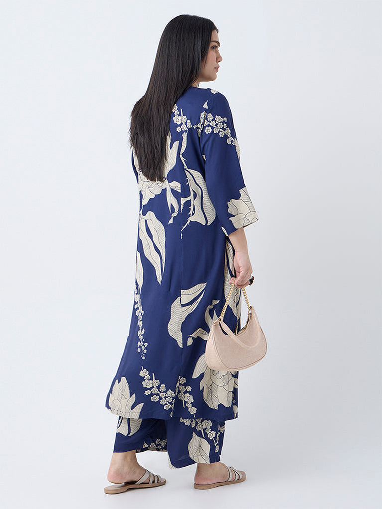 Festive days call for ease wrapped in elegance, and this indigo blue kurta from Diza captures just that spirit. Crafted from lightweight fabric, it radiates effortless grace through its delicate floral prints. The A-line silhouette flatters every form, while the band collar, button placket, and 3/4 sleeves lend a structured touch. Finished with a slip pocket for everyday practicality.