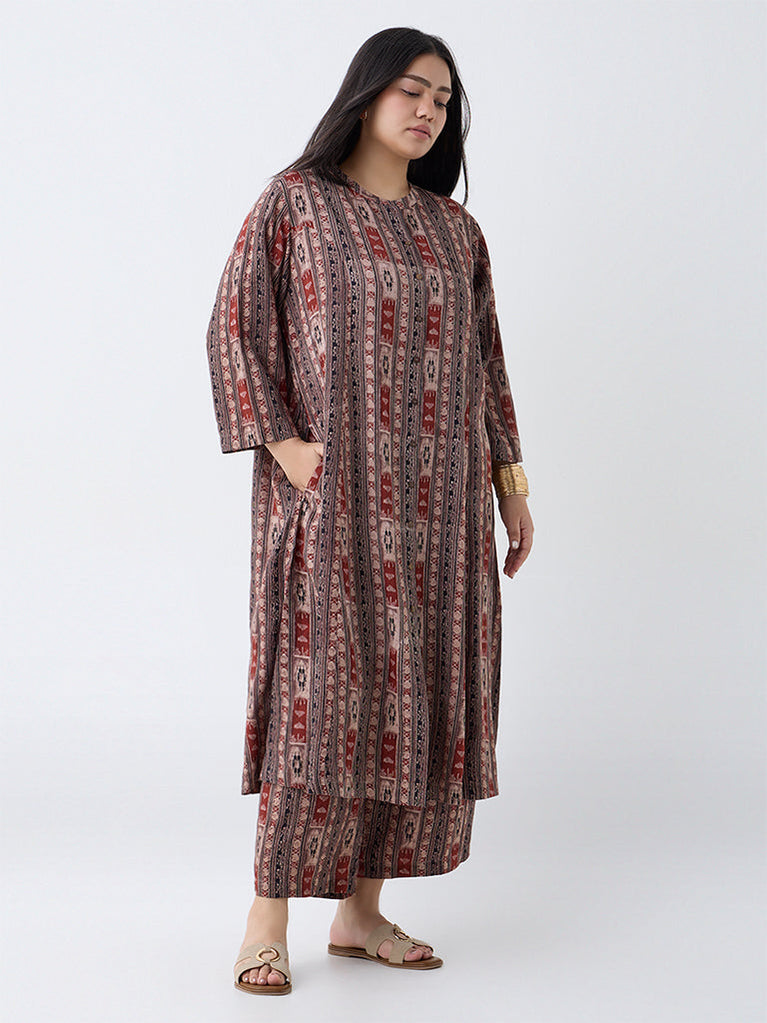 Update your ethnic wardrobe with this taupe A-line kurta from Diza. Featuring floral motifs in a contrasting hue, it’s designed with a band-neck collar and a button placket for a polished appeal. The three-quarter sleeves and side pockets add practicality and comfort, making it perfect for everyday elegance.