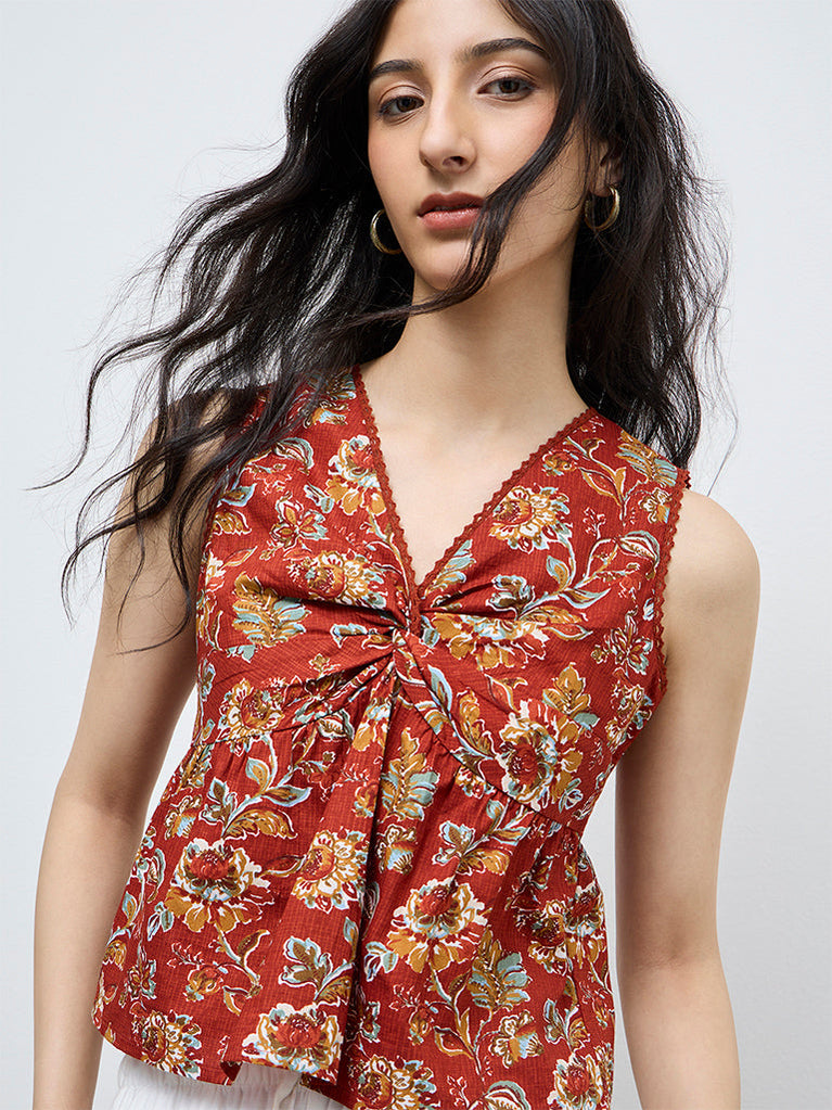 Bombay Paisley brings a playful twist to everyday styling with this rust top. Featuring an all-over floral print, it is styled with a knot-style detail at the front for added definition. Crafted from breathable cotton fabric, the silhouette is shaped with a V-neck and sleeveless cut, keeping the look light and comfortable. An easy option to pair with relaxed bottoms for casual daytime wear.