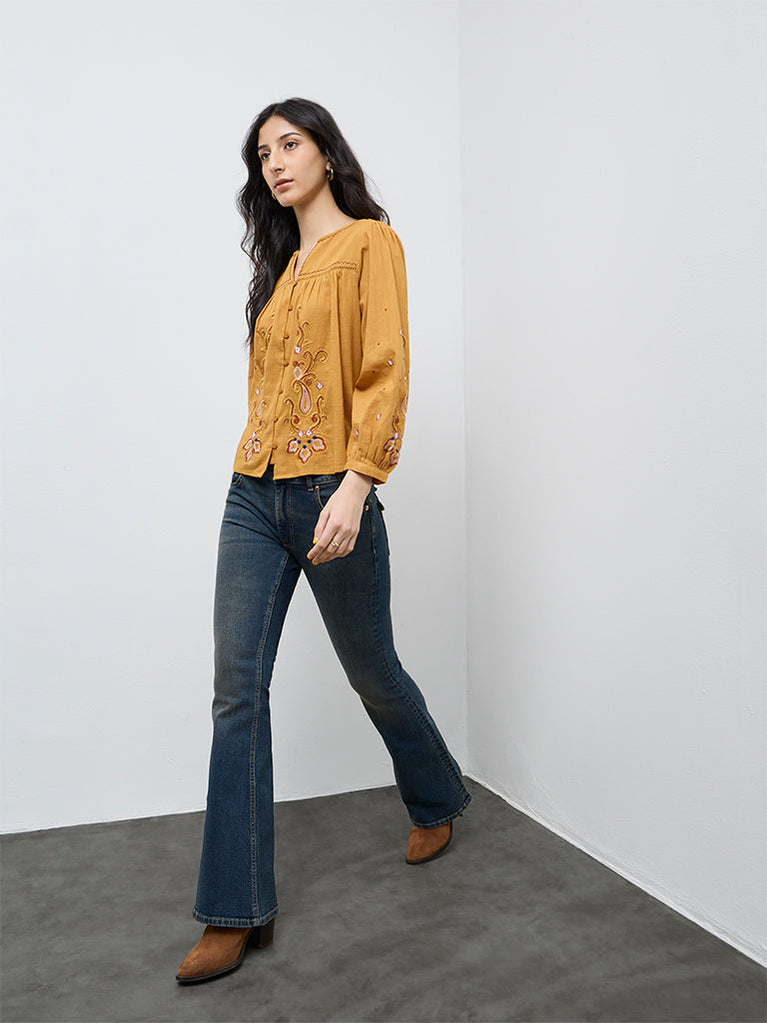 Rooted in intricate detailing, this yellow top from Bombay Paisley brings a distinctive touch to everyday styling. Embroidered motifs placed along the front add visual interest, complemented by a split neck, a buttoned placket and peasant sleeves that offer a relaxed structure. Milled from cotton-rich fabric, the style remains comfortable for casual, day-long wear.