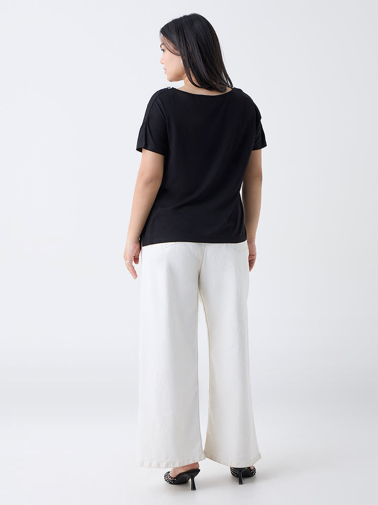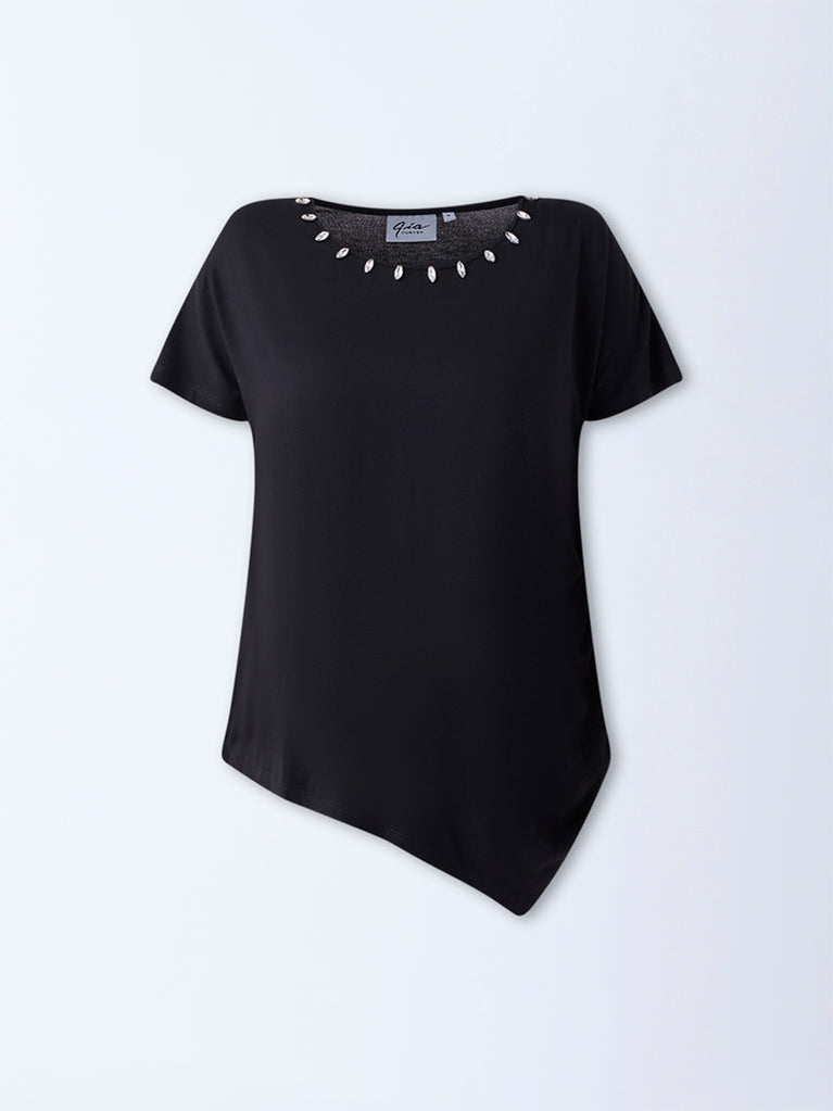 Gia introduces a touch of evening charm with this black top, styled with a graceful round neckline accented by sparkling diamanté detail. The relaxed silhouette and dolman sleeves create a fluid, flattering drape, while the asymmetric hemline adds a contemporary edge.