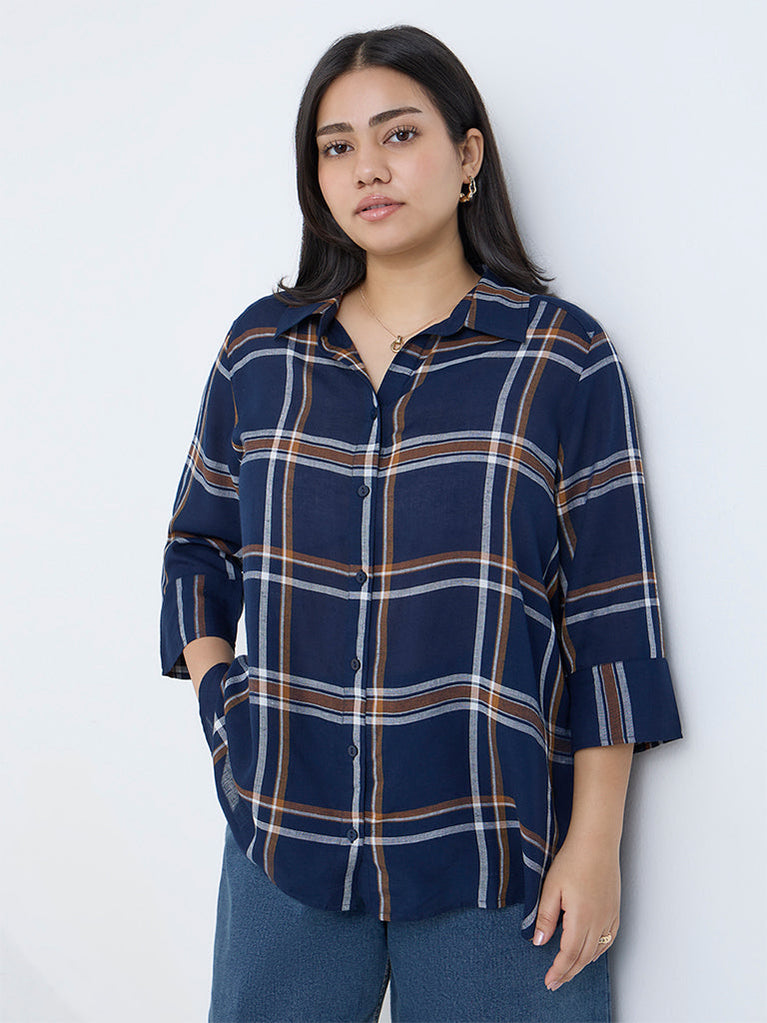 Gia launches this navy shirt defined by its checkered print that adds a contemporary touch to the classic silhouette. Crafted from an ultra-lightweight fabric that feels easy on the skin, it features a collar that leads into a button placket and three-quarter sleeves that offer relaxed wearability.