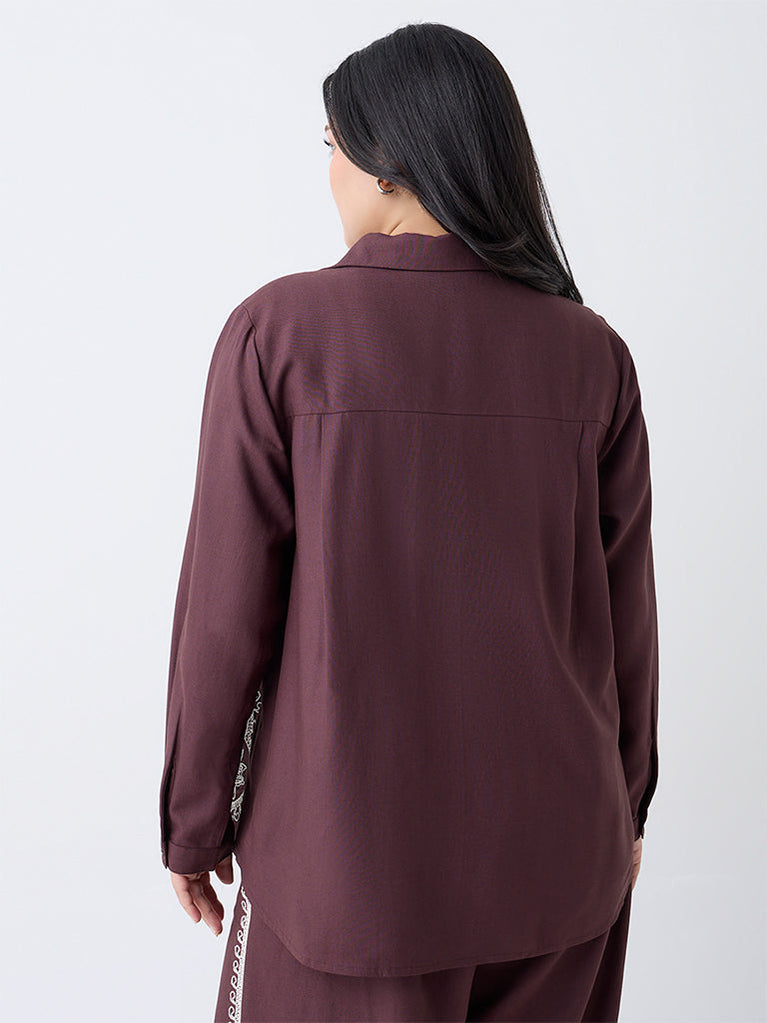 This dark brown shirt by Gia is beautifully detailed with intricate embroidery that brings depth and dimension to its refined design. Crafted from a sumptuous, drapey fabric that skims the body with ease, it features a structured collar and a concealed button placket for a clean, elongating front. Full sleeves with buttoned cuffs create a tailored finish perfect for dressing up denim or pairing with coordinated trousers.