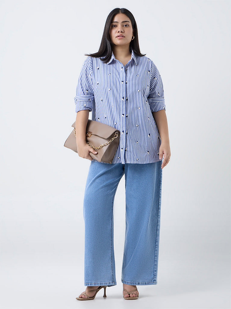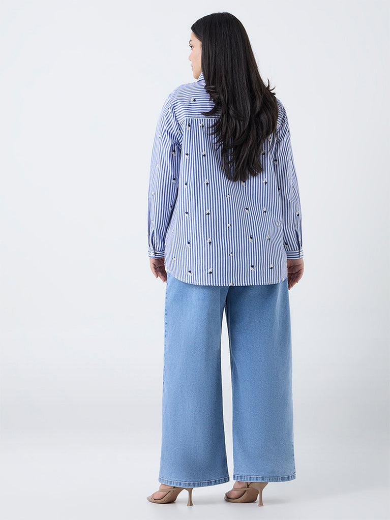 This blue shirt by Gia is elevated with delicate floral embroidery layered over a striped base, creating a refined blend of pattern and texture. Made from pure cotton for breathable comfort, it features a crisp collar that extends to a concealed button placket and full sleeves finished with buttoned cuffs.