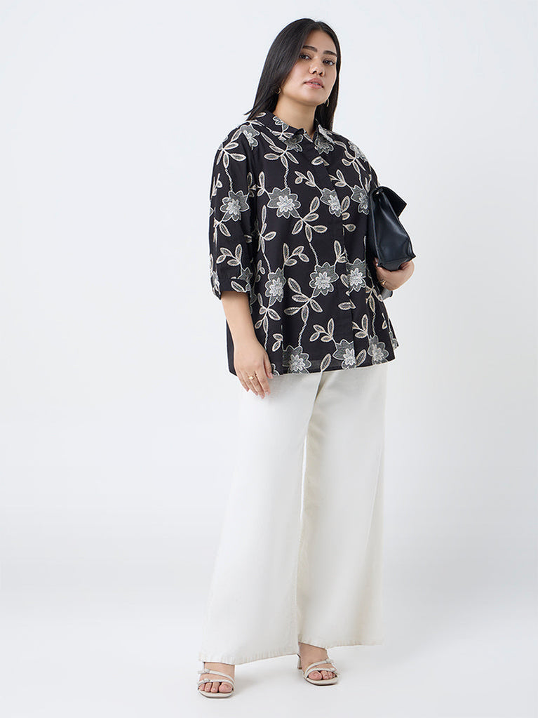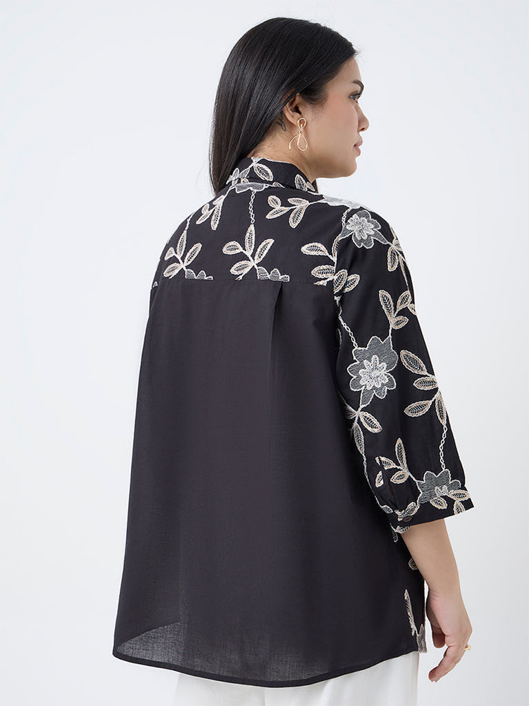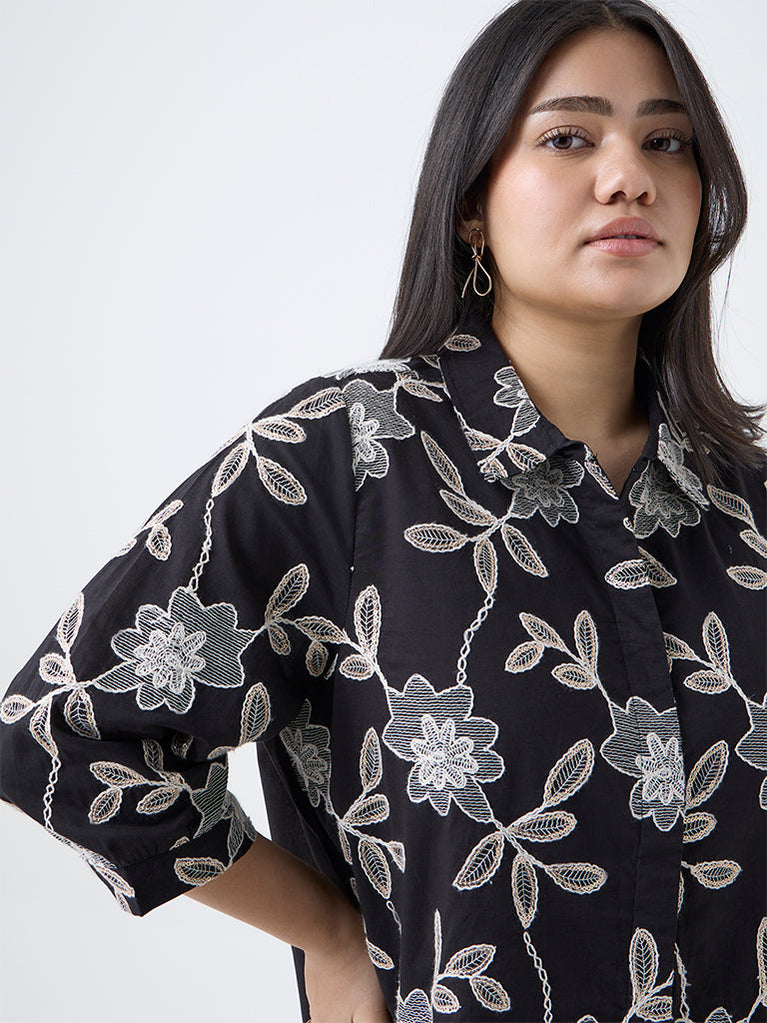This black blouse from Gia is decorated with delicate foliage embroidery that adds a soft, textured highlight across the front. Made from pure cotton for breathable comfort, the silhouette is framed with a crisp collar, a concealed button placket and three-quarter sleeves that balance structure with ease.