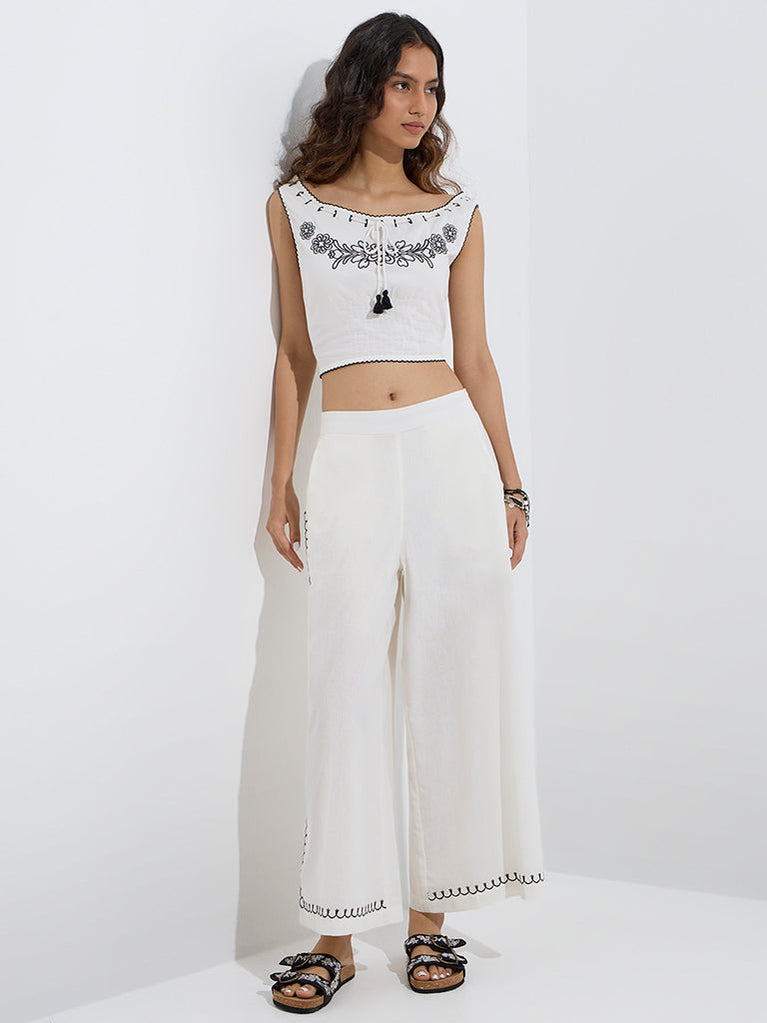 This white top from Bombay Paisley is adorned with intricate embroidery that adds a striking contrast to its minimal silhouette. Designed with a boat neck featuring a tassel-accented drawstring and a sleeveless cut, it offers a breezy appeal. The smocked panel at the back ensures a comfortable fit, while its pure cotton construction promises all-day breathability.