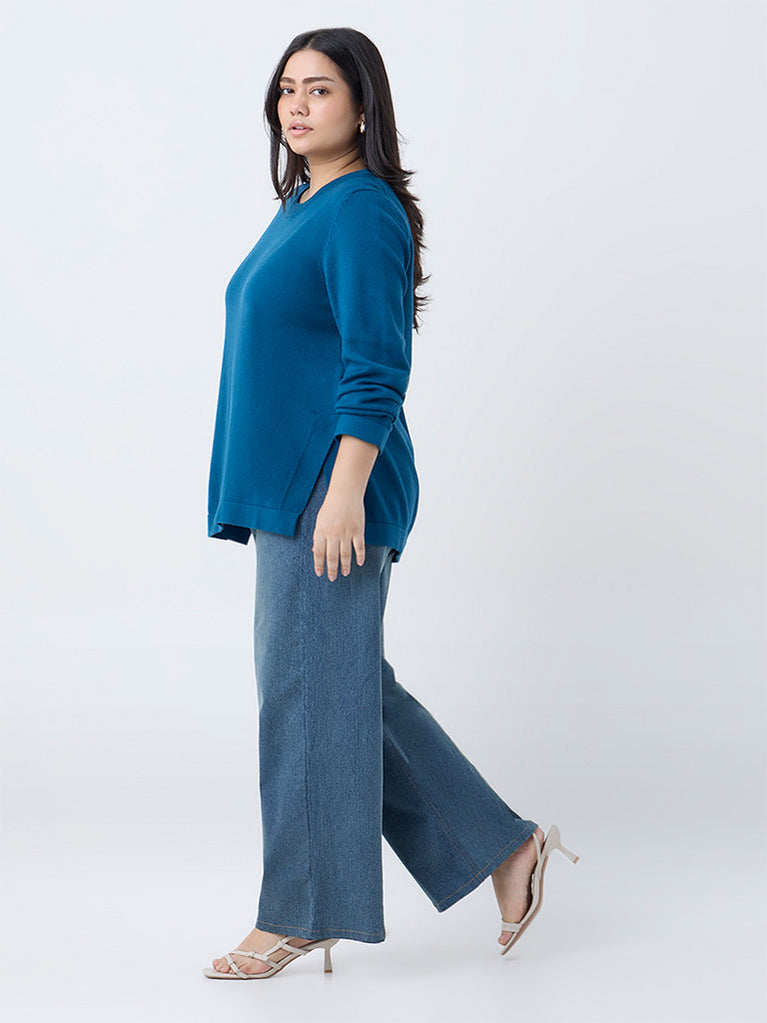 This blue solid sweater by Gia is crafted from a breathable fabric for lasting comfort. It features a refined knit texture with a ribbed round neck and full sleeves, while the side slits add a touch of ease and movement to the silhouette.