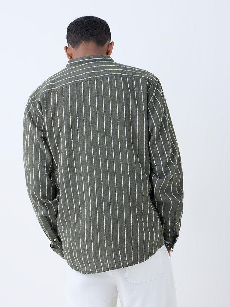 This olive shirt from ETA redefines your style with classic stripes that add rhythm and structure. The relaxed silhouette in a soft cotton-blend drapes effortlessly, while the mandarin collar and full sleeves introduce a touch of understated sophistication. A neat button placket ties it all together for a look that works well at brunch as it does at an evening gathering.