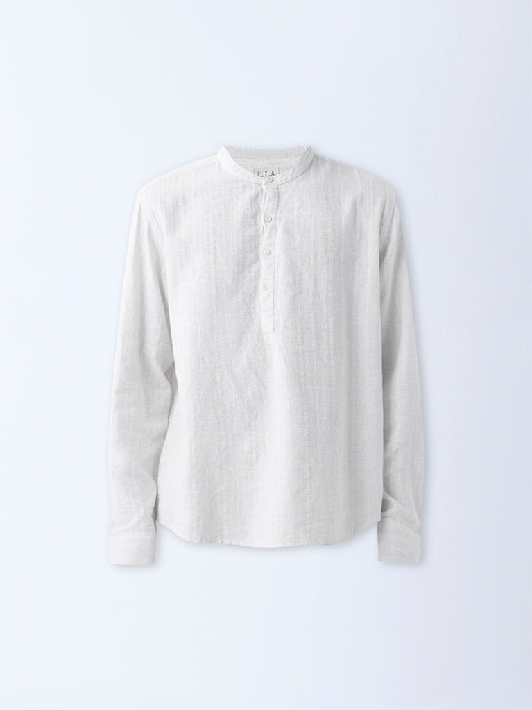 Fashioned for easy sophistication, this olive shirt from ETA showcases embroidered stripe patterns across a relaxed silhouette. Spun from pure cotton, it’s finished with a band-neck collar, full sleeves and a neat button placket for easy wear.