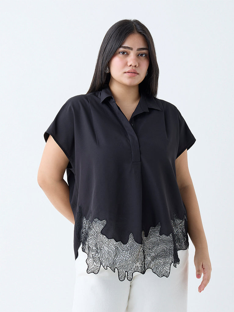 This black blouse from Gia is defined by intricate embroidered lace along the hem, adding a touch of elegance to everyday dressing. Designed with a smart collar and relaxed dolman sleeves, it’s crafted from a breathable fabric for all-day comfort.