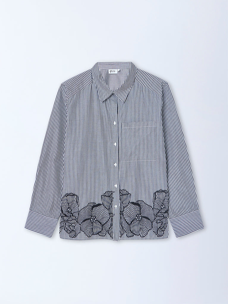 Gia gives classic stripes a chic update with this black shirt, highlighting floral embroidery along the hem for a feminine finish. Designed with a structured collar, button placket, full sleeves and a chest pocket, it’s a versatile piece that moves effortlessly from desk to dinner.