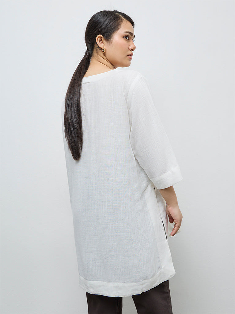 Celebrate effortless elegance with this white tunic from Diza, delicately adorned with floral embroidery for a fresh festive touch. Crafted from a sumptuous blended linen fabric, it features a classic round neck and 3/4th sleeves, while the high-low hemline adds a flattering flow.
