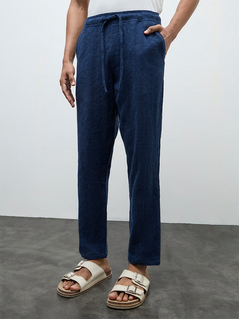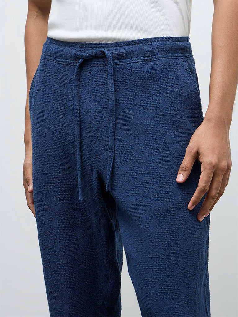 Made to support daily routines, these indigo chinos from ETA are woven from a cotton-rich fabric with a textured exterior that lends a soft-hand feel. The relaxed silhouette is complemented by a mid-rise waist, elasticated waistband and adjustable drawstrings for a flexible fit. Finished with multiple pockets, they bring ease and practicality to casual wardrobes.
