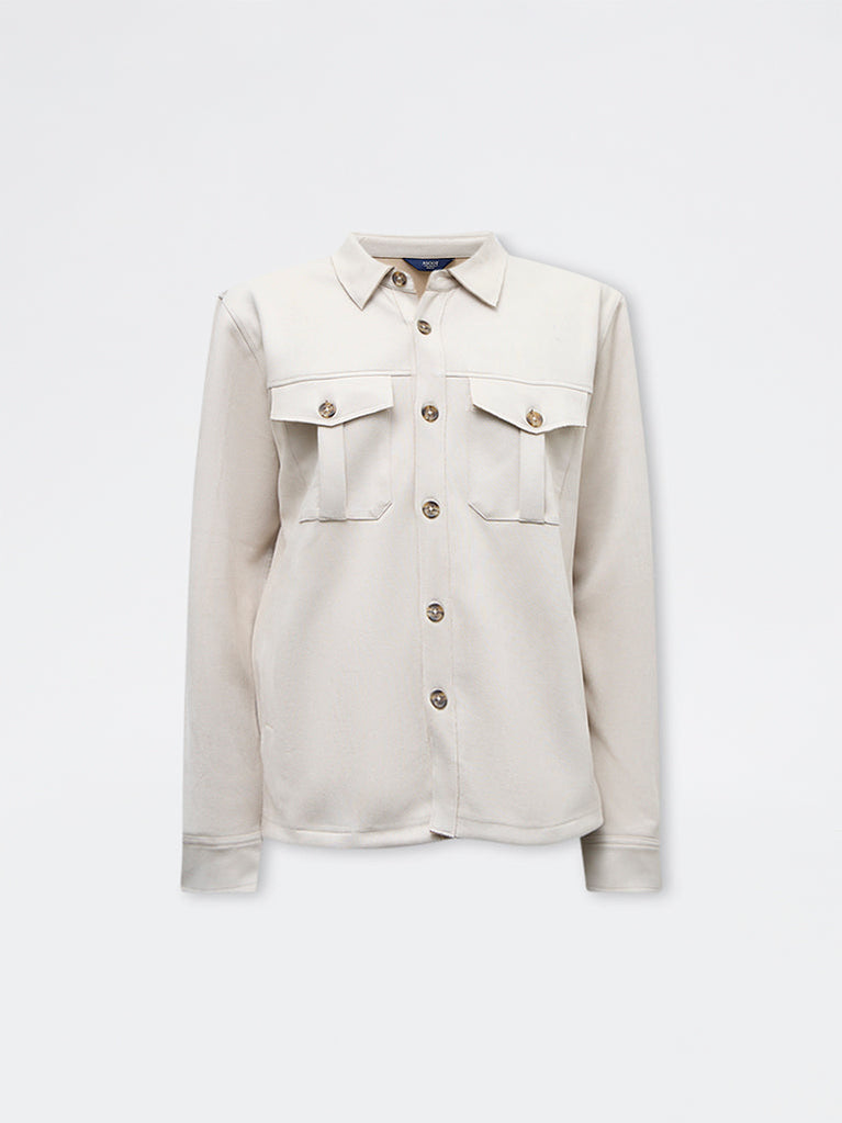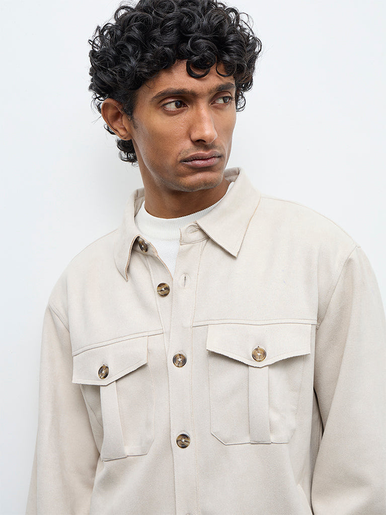 Winter styling feels elevated with this beige jacket from Ascot. Designed in a relaxed fit, it is detailed with a crisp collar, a button-up front, full sleeves and envelope pockets. Milled from a premium-blend fabric with a suede finish, it carries a smooth texture that works well for layered looks.