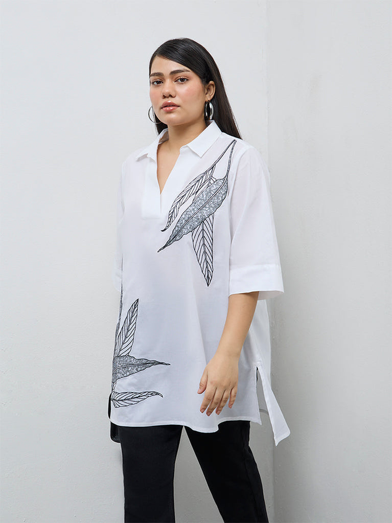 Diza White Leaf Embroidered Cotton Tunic