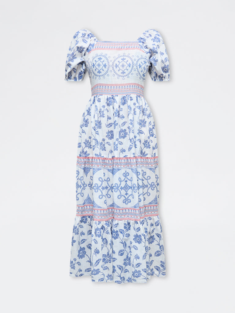 Embrace romantic charm with this pink dress from Bombay Paisley, crafted from pure cotton in a flowing tiered silhouette. Floral embroidery accents the bodice, while a square neckline and softly puffed sleeves complete the look with a vintage-inspired, boho finish.