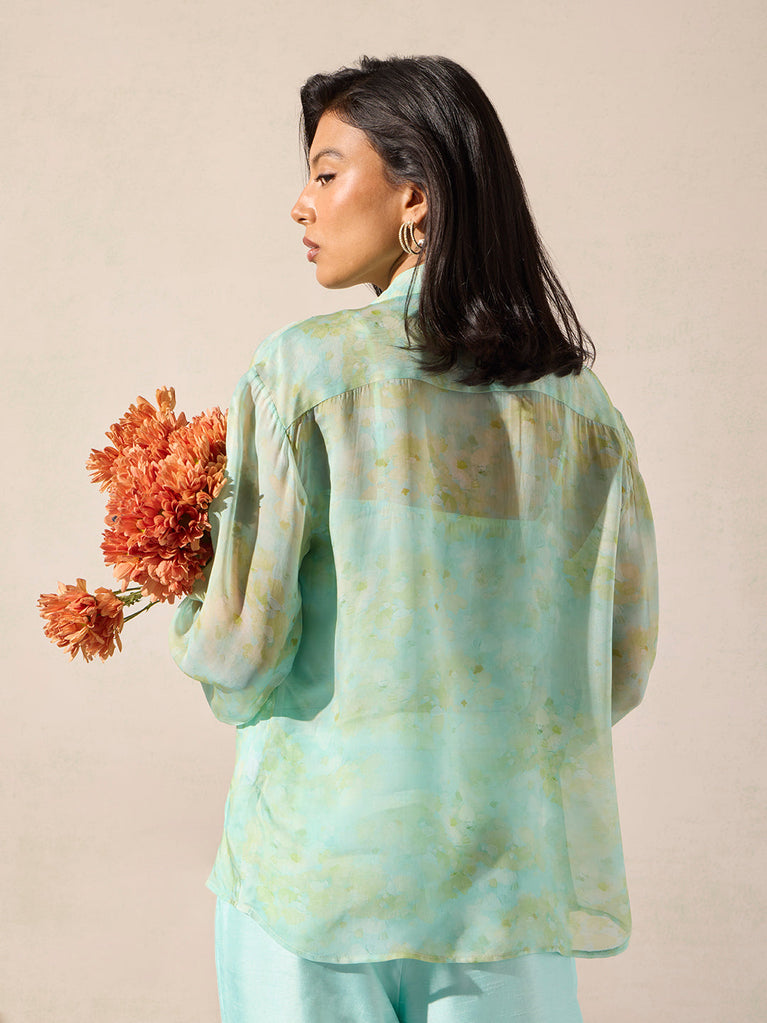 Perfect for warm-weather outings, this blue shirt and camisole set brings an easy elegance to daytime dressing. Crafted from a sheer fabric, the shirt features a collar, concealed button placket, full sleeves, and delicate beadwork along the front that adds refined detail. Worn over a matching camisole, the look offers comfortable coverage with a breezy, translucent finish.