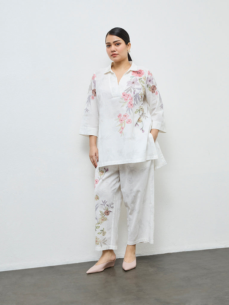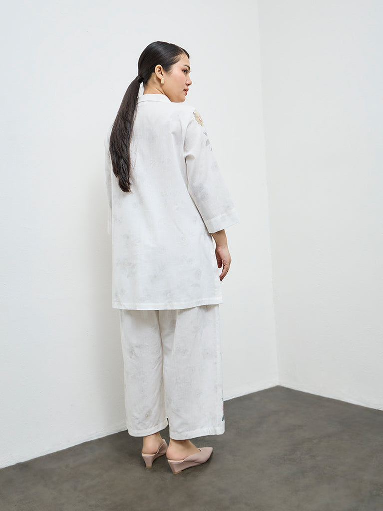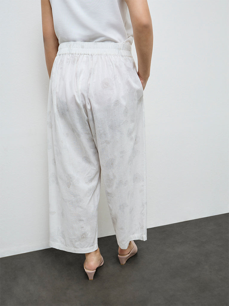Diza White Floral Design Cotton-Blend Pants