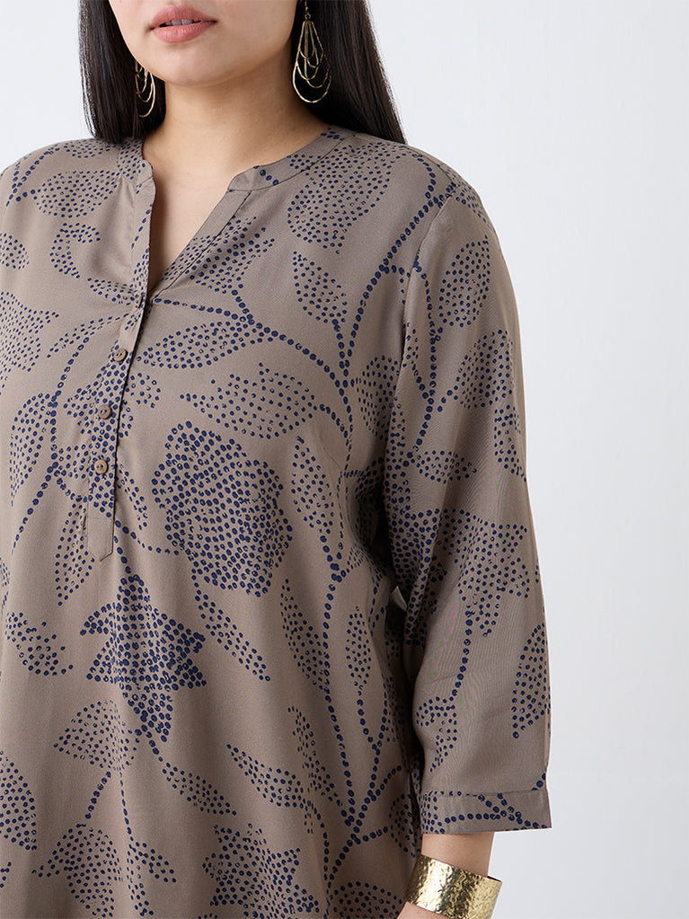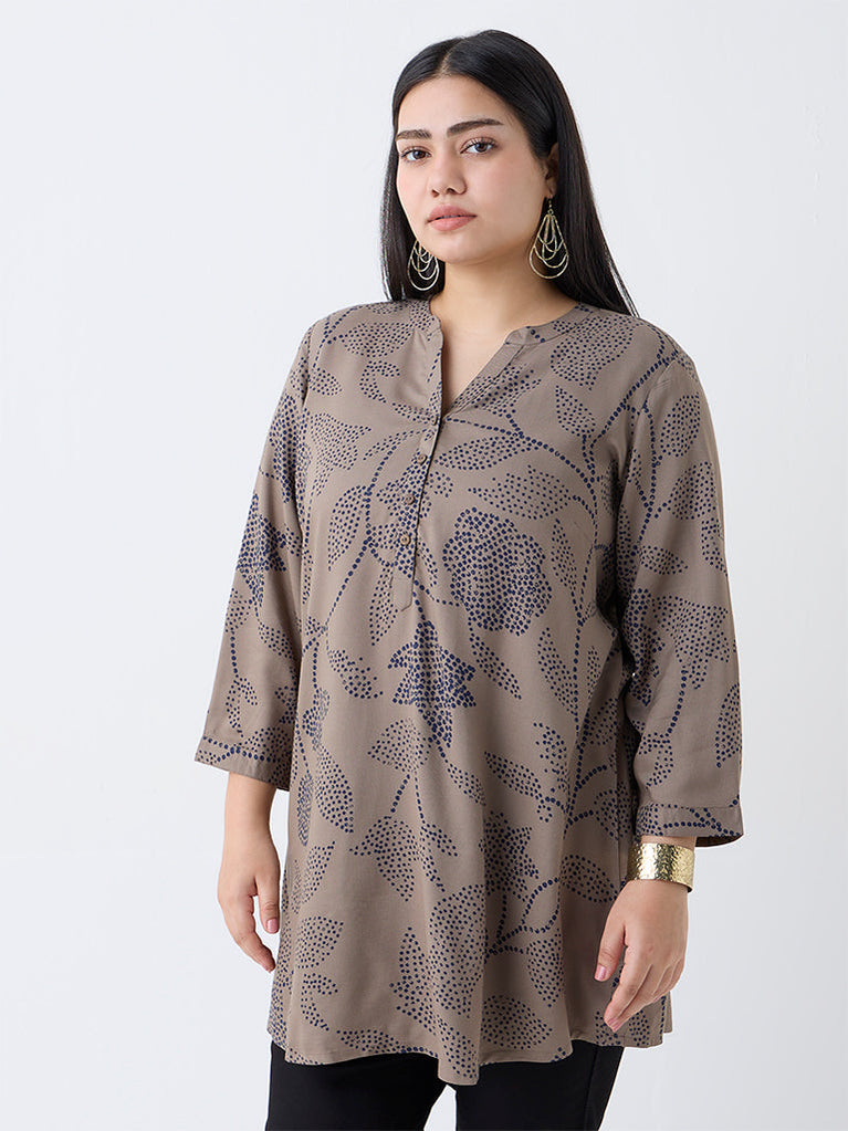 Diza taupe tunic brings a warm, earthy palette to life with foliage prints, creating a balanced blend of comfort and charm. Designed with a notched neckline, a neat quarter button placket, and three-quarter sleeves, this lightweight piece offers relaxed sophistication for day-to-day ethnic styling.