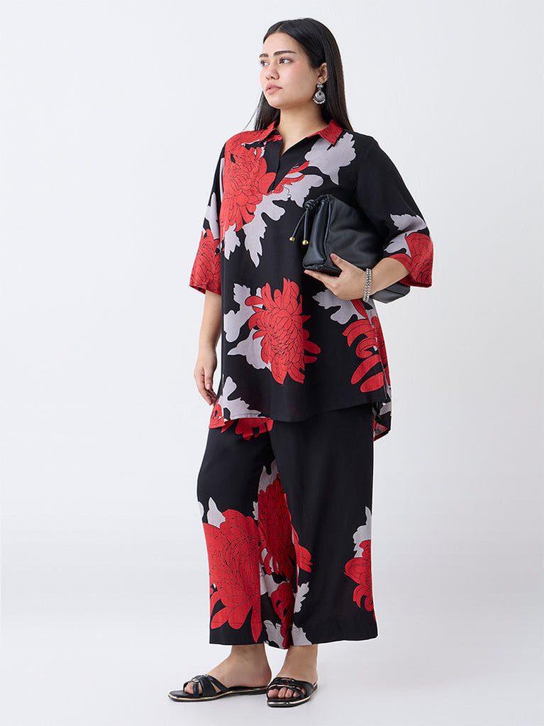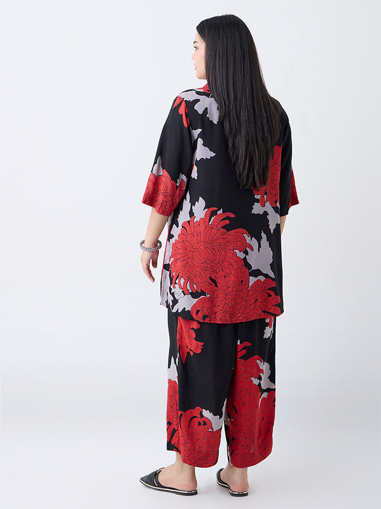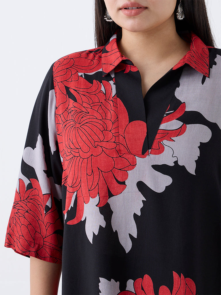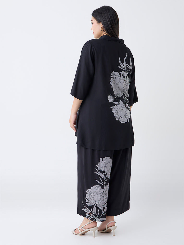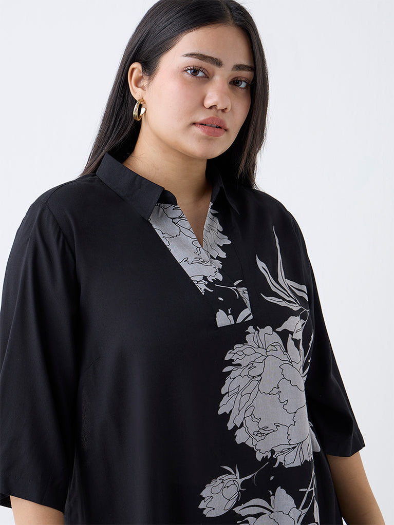 Quietly expressive, this black tunic from Diza is adorned with all-over foliage prints that add timeless charm. Cut from a lightweight fabric that drapes smoothly, it features a spread collar and three-quarter sleeves—an easy, versatile pairing for relaxed ethnic separates.