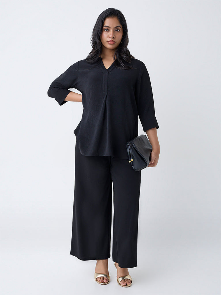Minimalist yet impactful, this black top from Gia is defined by its notched neckline and 3/4th sleeves. Cut for an easy drape, it brings together comfort and modern refinement.