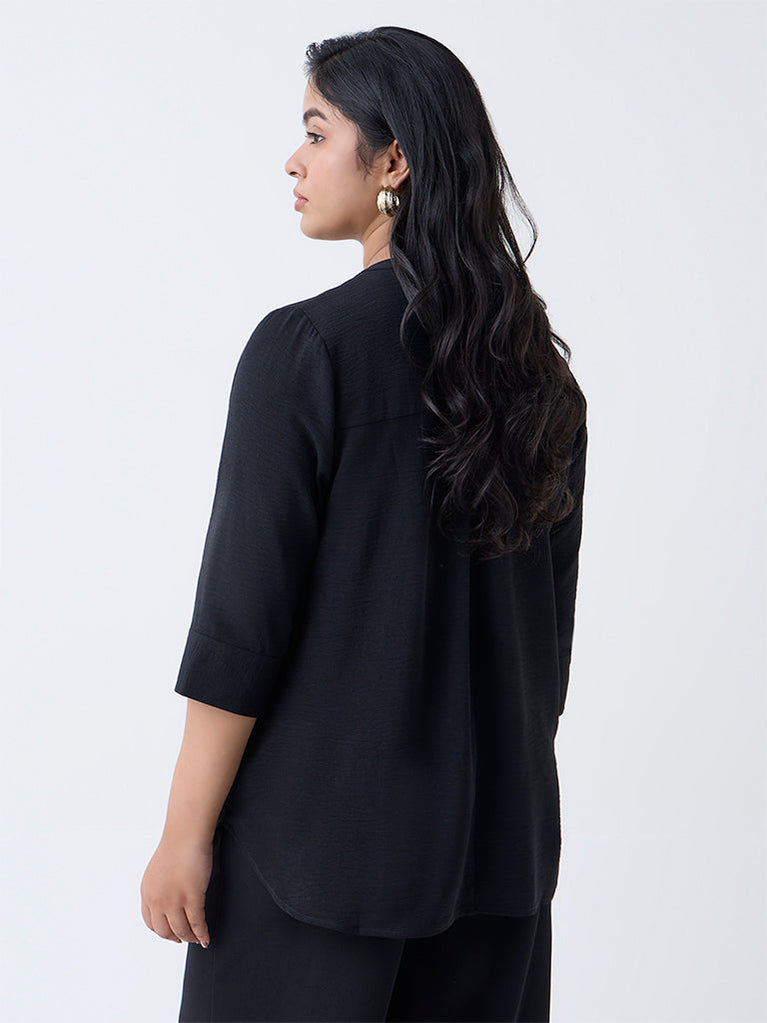 This black shirt from Gia blends everyday ease with considered detailing. The premium lightweight fabric is elevated with floral embroidery on the front, adding texture without overwhelming the look. Designed with a classic collar, concealed button placket, and three-quarter sleeves, it delivers a chic, contemporary vibe that flatters with ease.