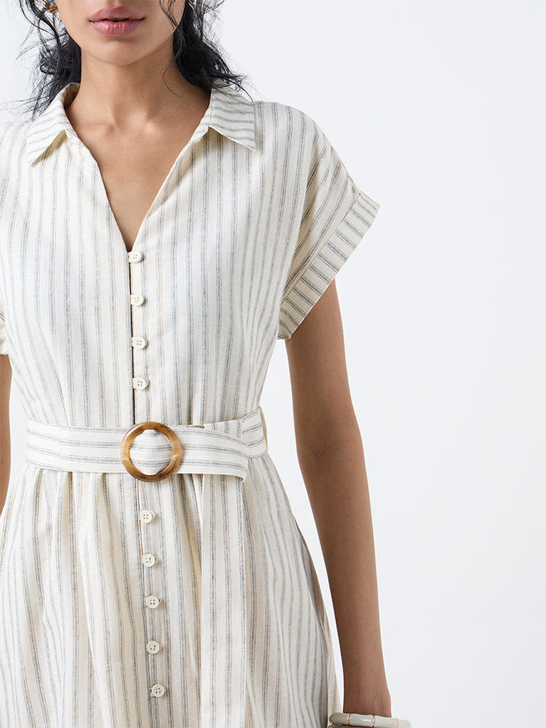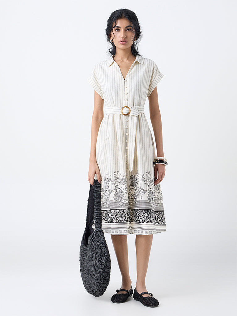 Refresh your summer wardrobe with this off-white dress by Bombay Paisley, designed with stripes that transition into floral prints along the hem for a playful visual shift. Crafted from a cotton-rich fabric in a fluid A-line shape, it features a V-neck, dolman sleeves and a neat button-up front that adds structure to the airy silhouette. A matching belt with a wooden buckle cinches the waist, while side pockets introduce everyday ease.