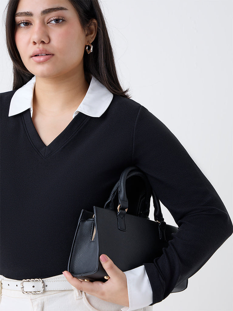 This black T-shirt from Gia is crafted from a breathable, soft-touch fabric that feels easy through long hours. The contrast collar adds a clean pop of definition, while the full sleeves offer comfortable coverage. A versatile everyday essential designed to fit and flatter with minimal effort.