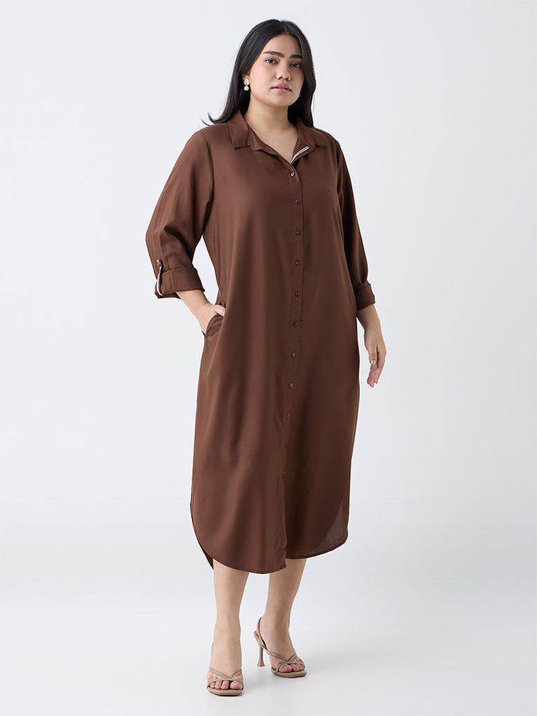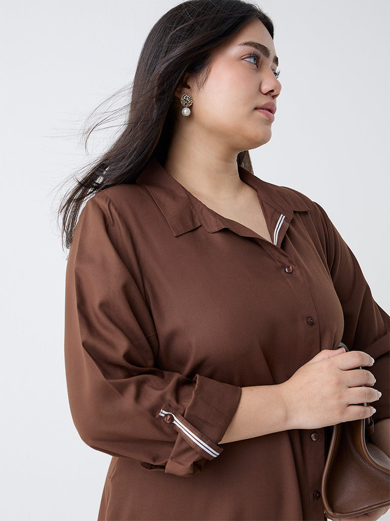 Gia reimagines everyday ease with this dark brown shirtdress, crafted in a featherlight fabric that moves beautifully. The sleek collar, clean button placket and full sleeves create a contemporary silhouette.