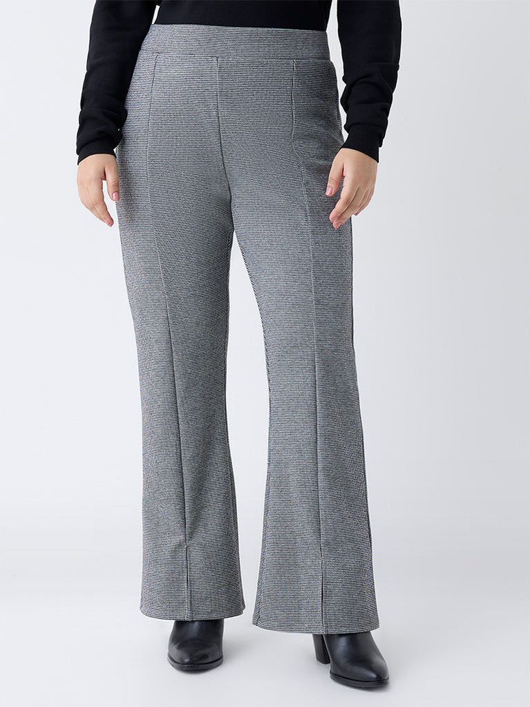 Gia introduces these grey trousers crafted from premium fabric in classic checks. Designed in a flattering bootcut silhouette, they offer a blend of structure and stretch for a smooth, contoured fit. The elasticated waistband provides secure comfort, while the refined pattern brings a polished edge to everyday dressing.