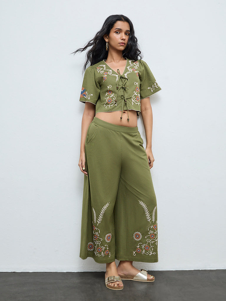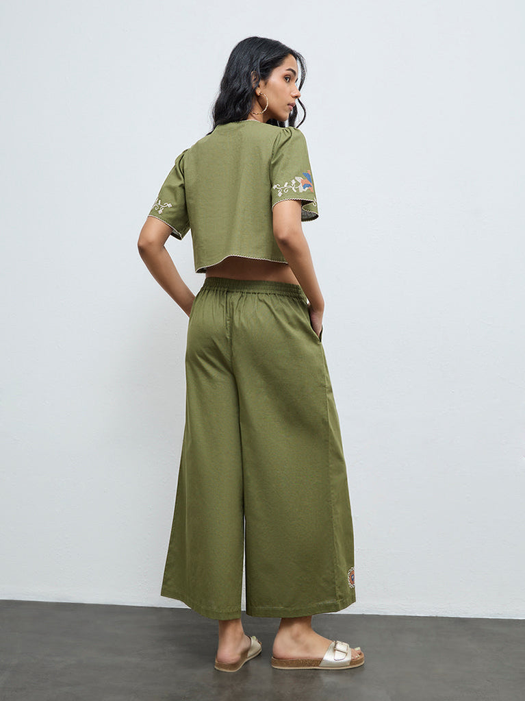 Bombay Paisley Green Embroidered Cotton-Blend Palazzos