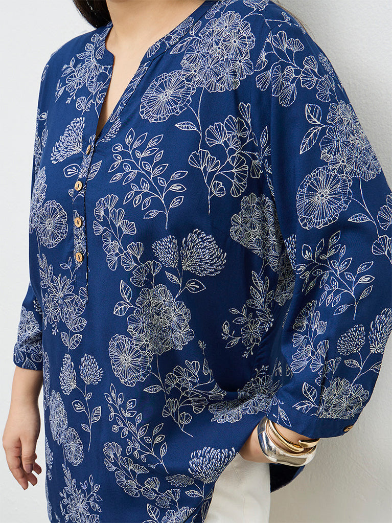 Created with everyday wear in mind, Diza offers this indigo tunic featuring floral patterns, exuding an easy ethnic appeal. It is milled from a soft, lightweight fabric for a comfortable feel through the day. A mandarin neck is complemented by a brief button placket and three-quarter sleeves, keeping the overall silhouette clean and balanced.