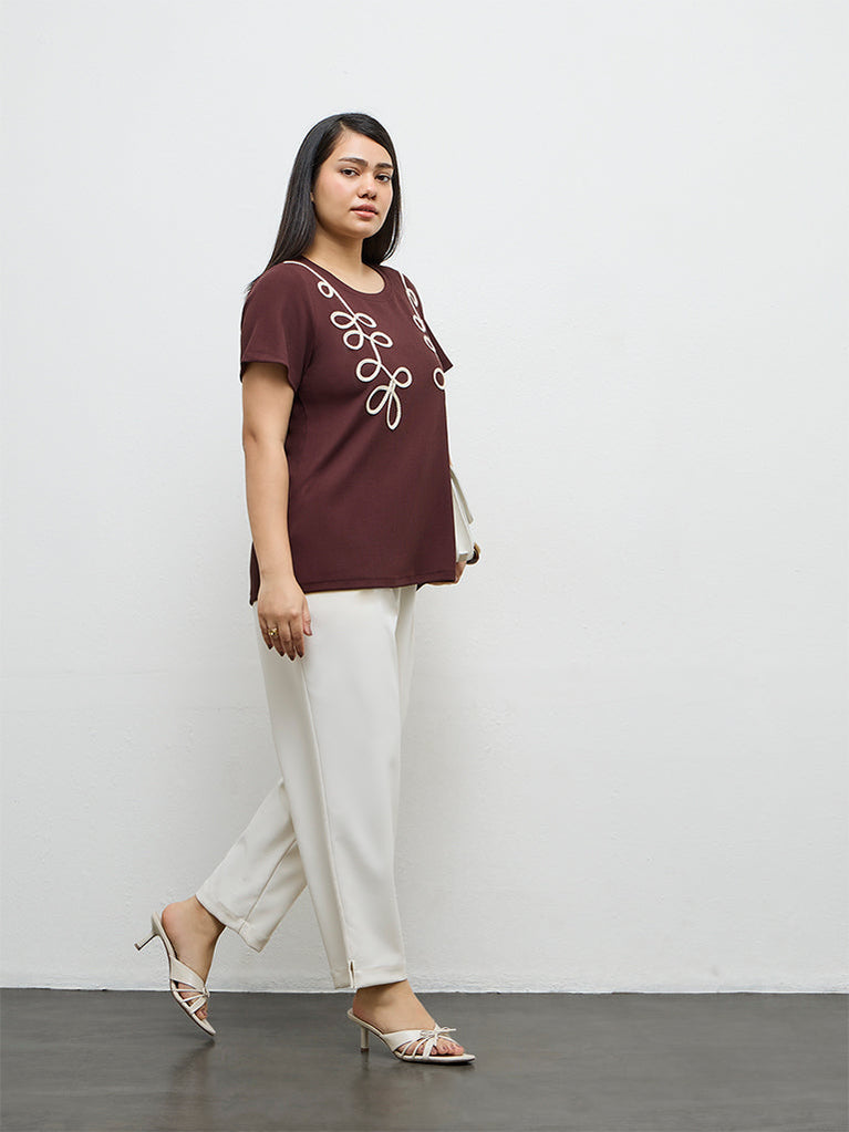 This brown T-Shirt by Gia offers an easy, refined option for everyday wear. It is exhibits striking embroidery on a ribbed textured base and is framed with a round neck and short sleeves for an easy silhouette. The breathable fabric build feels light and comfortable through the day.