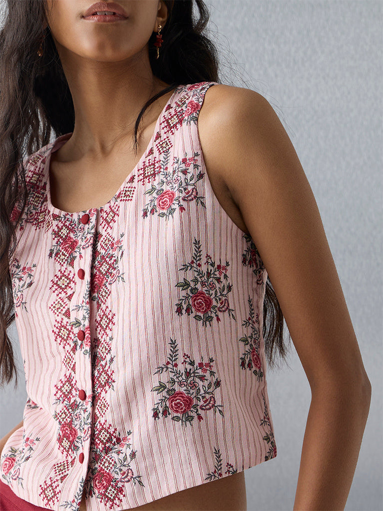 Infused with playful charm, this pink cotton top from Bombay Paisley pairs delicate floral motifs with subtle stripes for a modern twist. The round neck and button placket lend a touch of classic ease, while the sleeveless silhouette keeps it light and breezy.