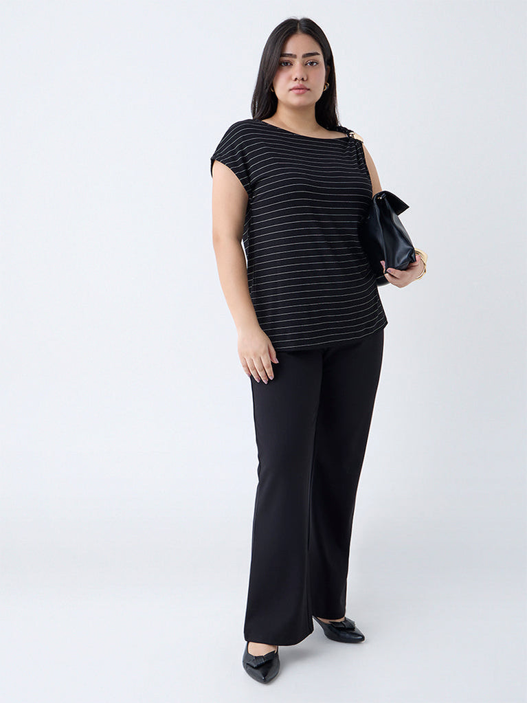 Gia introduces a black top that balances minimalism with standout detailing. A gold-toned hardware near the boat neck gives it an edgy lift, while dolman sleeves add relaxed volume for effortless ease. Created from a lightweight fabric with subtle pinstripes, the t-shirt drapes fluidly, making it a versatile piece for casual or semi-polished styling.