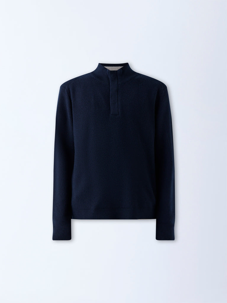 Ascot introduces a navy sweater designed to anchor the modern wardrobe. The knit texture adds dimension, while the high neck with zip-and-button detailing offers functional sophistication. Relaxed in fit yet elevated in finish, it delivers warmth and quiet confidence in equal measure.