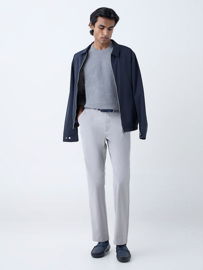 Ascot introduces this light grey jacket, tailored with a smooth suede exterior for a refined finish. Designed with a mock collar, a zipper front and full sleeves, it is complemented with kangaroo pockets at the front for utility. Lightweight in feel yet polished in appearance, it makes a versatile layer for modern wardrobes.