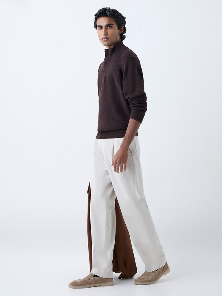 Ascot introduces this dark brown sweater as a study in understated luxury. The textured knit and relaxed fit are complemented by a high neck secured with a zip-and-button fastening, along with full sleeves for comfort. Designed for versatility, it lends quiet sophistication to both tailored and off-duty pairings.