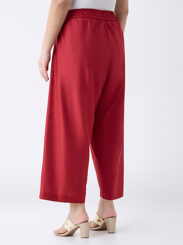 Designed for effortless pairing, these red ethnic pants by Diza are cut from a fluid silhouette with a smooth elastic waistband and drawstring for all-day comfort. Featuring practical side pockets, the solid hue lends itself to festive styling, making it a versatile base for embellished kurtas and tunics.