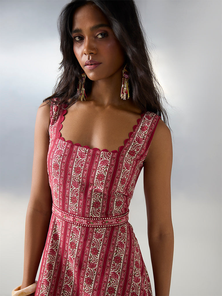 Bombay Paisley presents this red dress adorned with floral prints across the silhouette. Cut from breathable pure cotton, it features a square neck, sleeveless design and a smocked back that ensures comfort. A breezy piece that makes a charming choice for sunny-day outings.